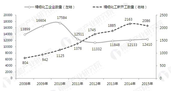 2009-2015年我國精細化工企業數量與新開工項目數量對比(單位:個,項)